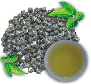 Жасминовая жемчужина - один из знаменитых и популярных китайских чаев с жасмином. Длинные тонкие листочки скручены в маленькие жемчужины с серебряными прожилками. Чай собирают весной, сразу производят процесс закручивания листьев в "жемчужины" и бережно хранят до созревания цветков жасмина. Потом чай ароматизируют натуральным способом,раскладывая чай среди цветущих кустов жасмина. Зная впитывающую способность чая,производители пользуются этим во благо создания элитных сортов чая. Таким образом получается восхитительный чай с легким ароматом жасмина.