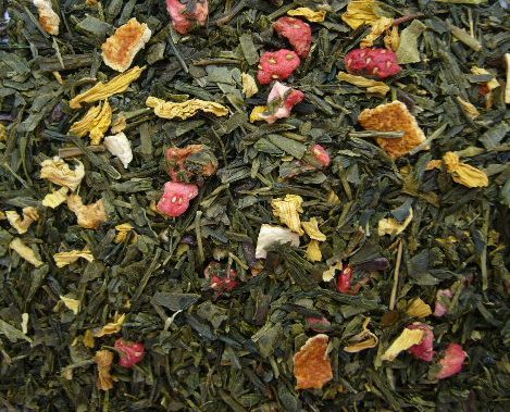 Яркая смесь на основе зеленого чая с добавлением цедры апельсина и кусочков земляники, ароматизированная натуральным апельсиновым соком.